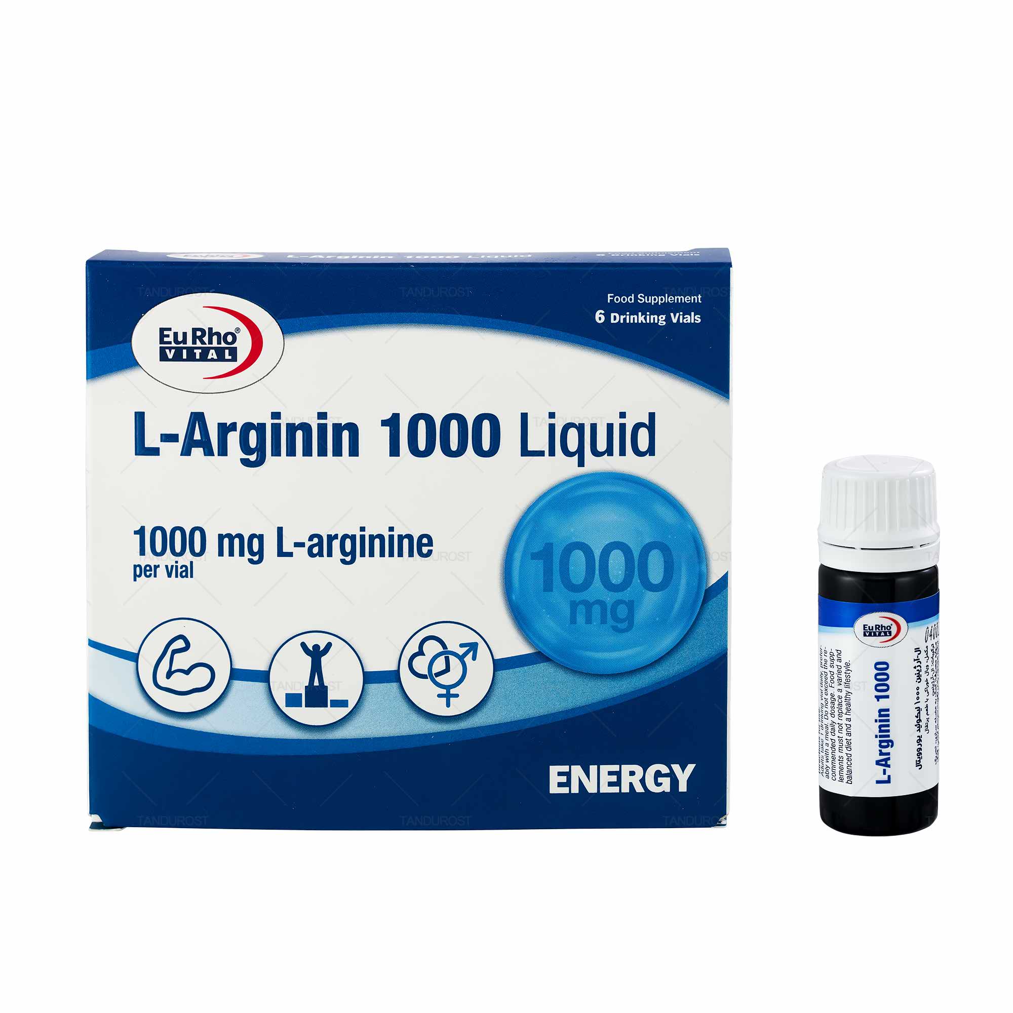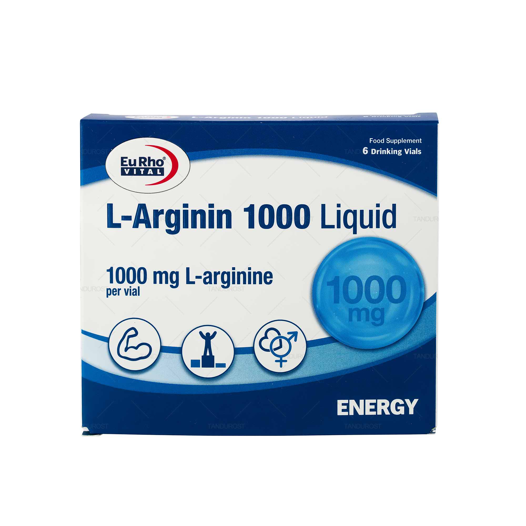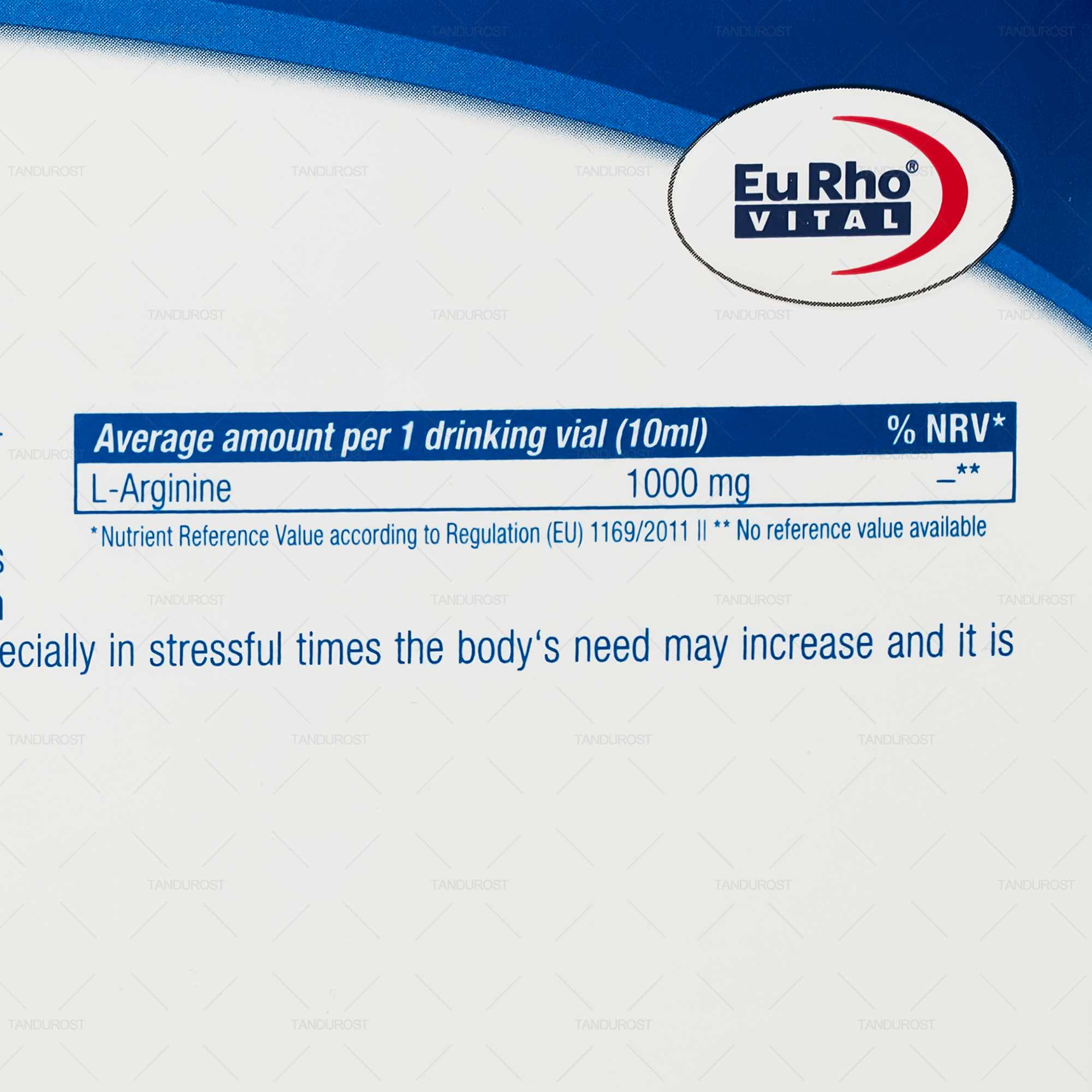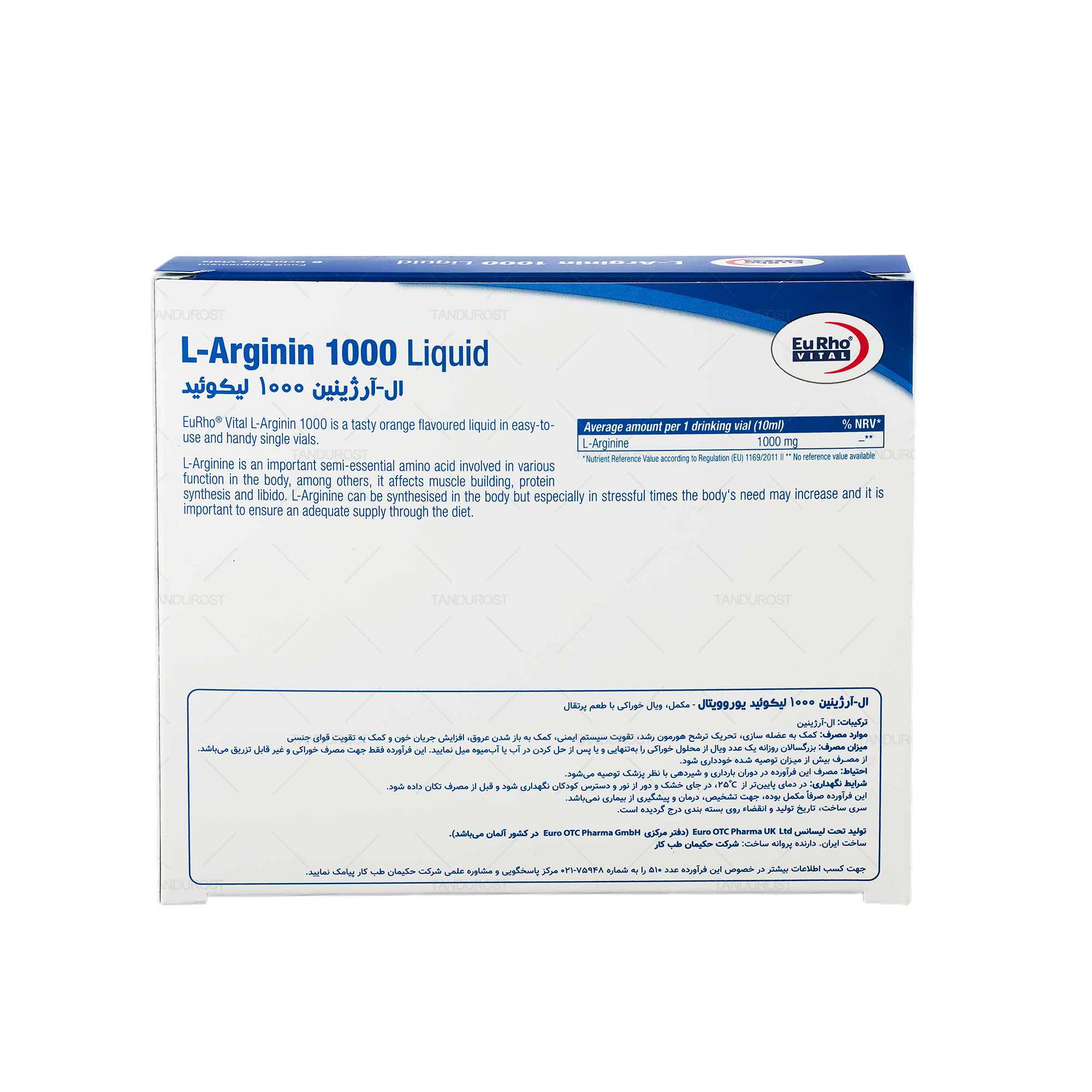 آرژنین مایع 1000 یورو ویتال آلمال که تحت لیسانس این شرکت در داخل کشور بسته بندی می گردد به صورت ویال های 10 میلی لیتری و در بسته بندی 6 عددی بوده، که هر ویال آن حاوی 1000 میلی گرم آرژنین خالص می باشد. آرژنین از آمینو اسیدهای نیمه ضروری بوده که بیشترین میزان نیتروژن را در خود گنجانده است. این ماده برای تولید نیترو اکساید در بدن ضروری بوده که خود نیتروکساید نیز باعث گشادی عروق و افزایش خون رسانی به عضلات می شود، که در نهایت کارایی ورزشکار مخصوصا در تمرینات هوازی بالا می رود. این مکمل ورزشی به تنظیم مقدار نمک بدن نیز کمک می کند. آرژنین مایع 1000 یورو ویتال آلمان به دلیل ماهیت مایع بودن از سرعت جذب بیشتر و در نهایت سرعت تاثیر بیشتری نسبت به انواع قرصی آن برخوردار می باشد.