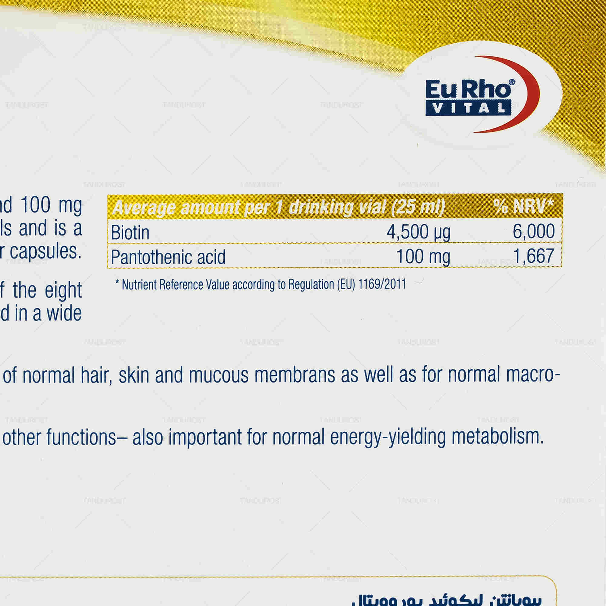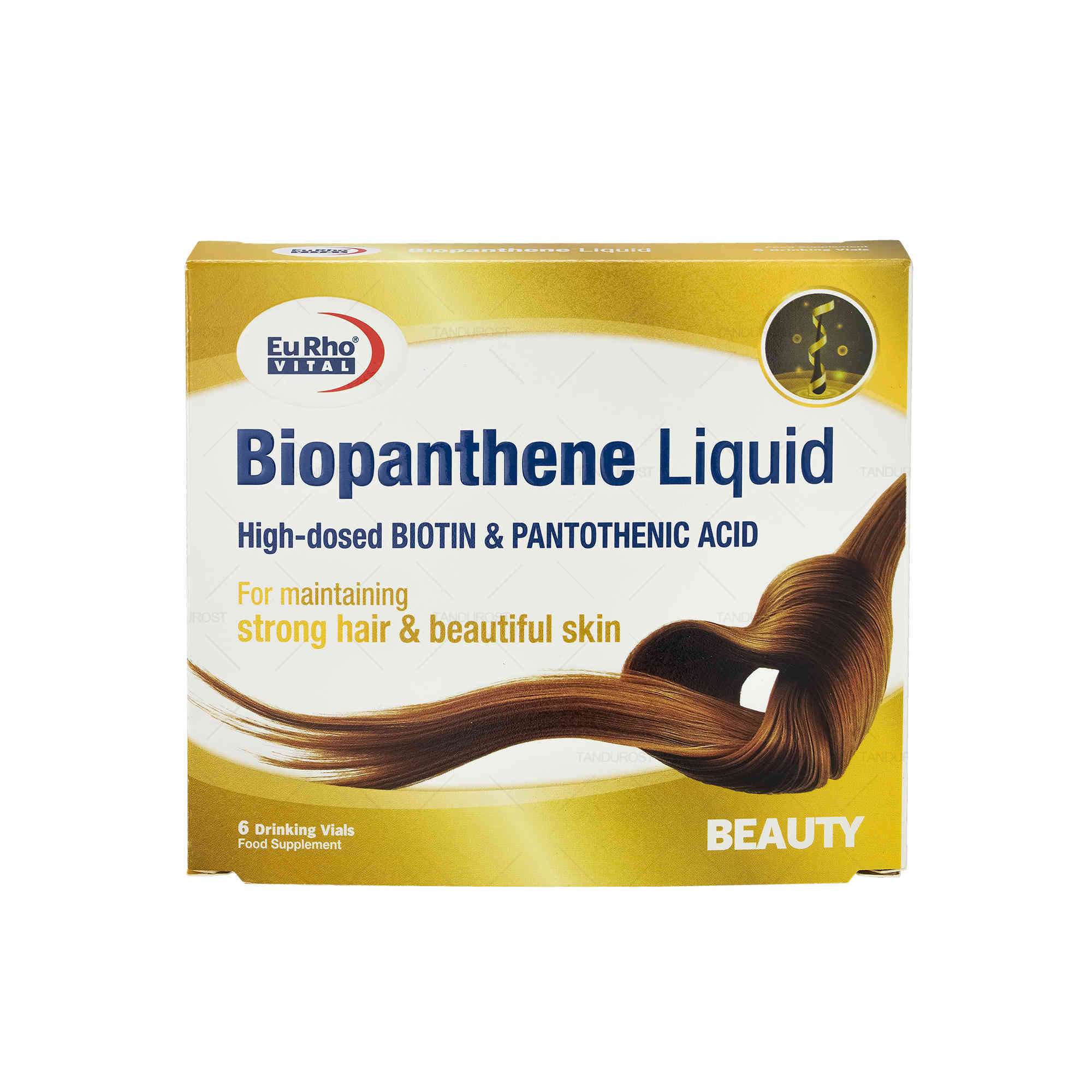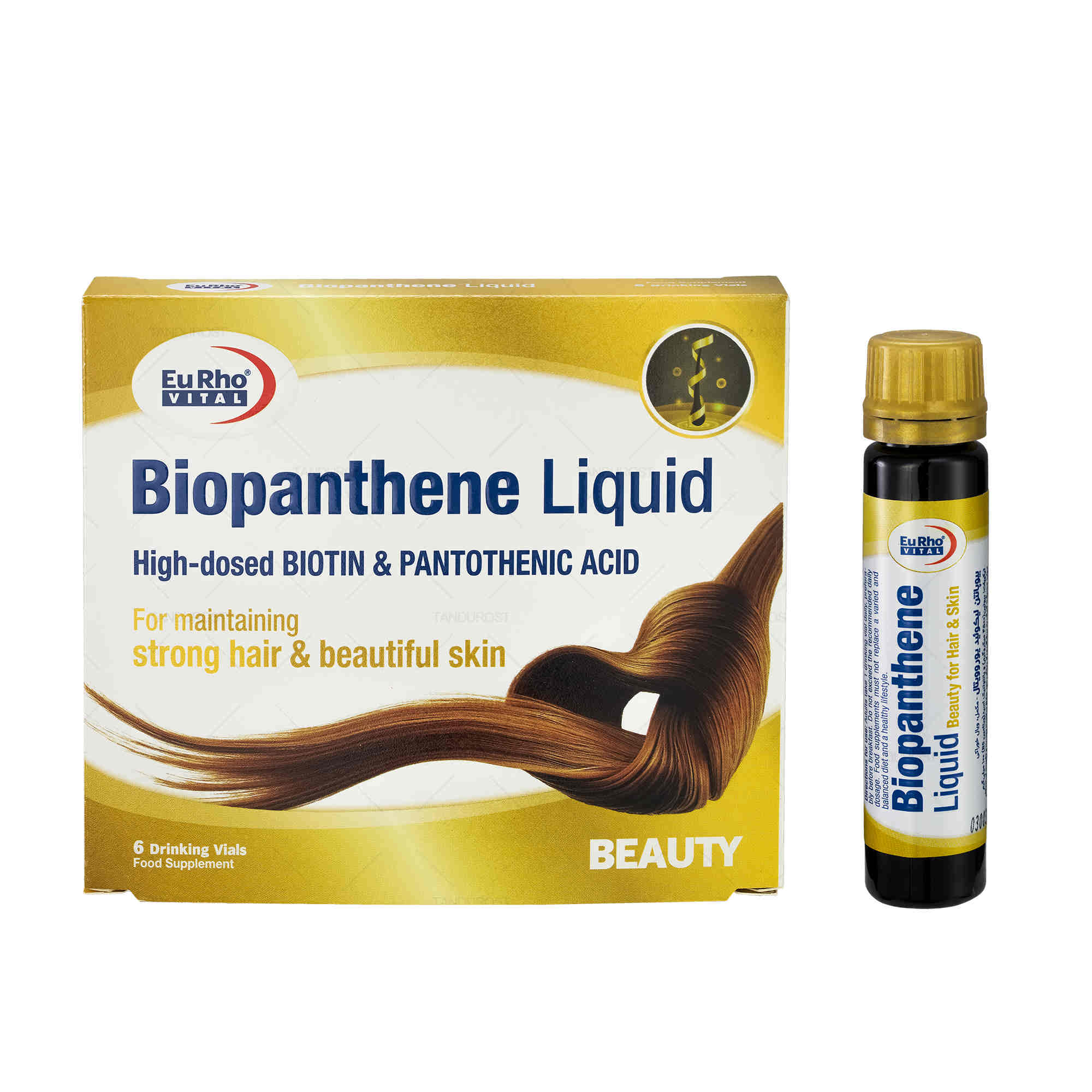 ویال بیوپانتن لیکوئید یورو ویتال آلمان که تحت لیسانس این شرکت در داخل کشور بسته بندی می گردد مکمل تقویتی بسیار باکیفیتی جهت تقویت و استحکام مو و جلوگیری از نازک شدن و ریزش مو می باشد. کمبود بیوتین یا ویتامین B7 یکی از دلایل شایع ریزش مو و شکنندگی ناخن ها و همچنین احساس خستگی و ضعف عضلانی می باشد و کمبود بپانتین یا ویتامین B5 یا اسید پانتوتنیک سبب کم حجم شدن موها کدر شدن و از دست رفتن شفافیت موها و خشکی و کدری پوست و خستگی و ضعف عضلانی می شود، بنابراین پیداست که بیتین بپانتین چه نقش مهمی و حفظ و سلامت پوست و موها ایفا می کنند. ویال بیوپانتن لیکوئید یورو یتال به دلیل فرم مایع آن هم از کیفیت ساخت بسیار بالایی برخوردار بوده و هم بسیار زود جذب بوده و سریع اثر خود را در بودن نشان می دهد. بیوپانتن لیکوئید یورو ویتال همان طور که گفته شد به صورت 6 عدد ویال های مایع خوراکی تولید شده که حجم هر ویال 25 میلی لیتر می باشد. هر ویال این مکمل تقویتی حاوی 4500 میکروگرم بیوتین و 100 میلی گرم بتانتین یا اسید پانتوتنیک می باشد.