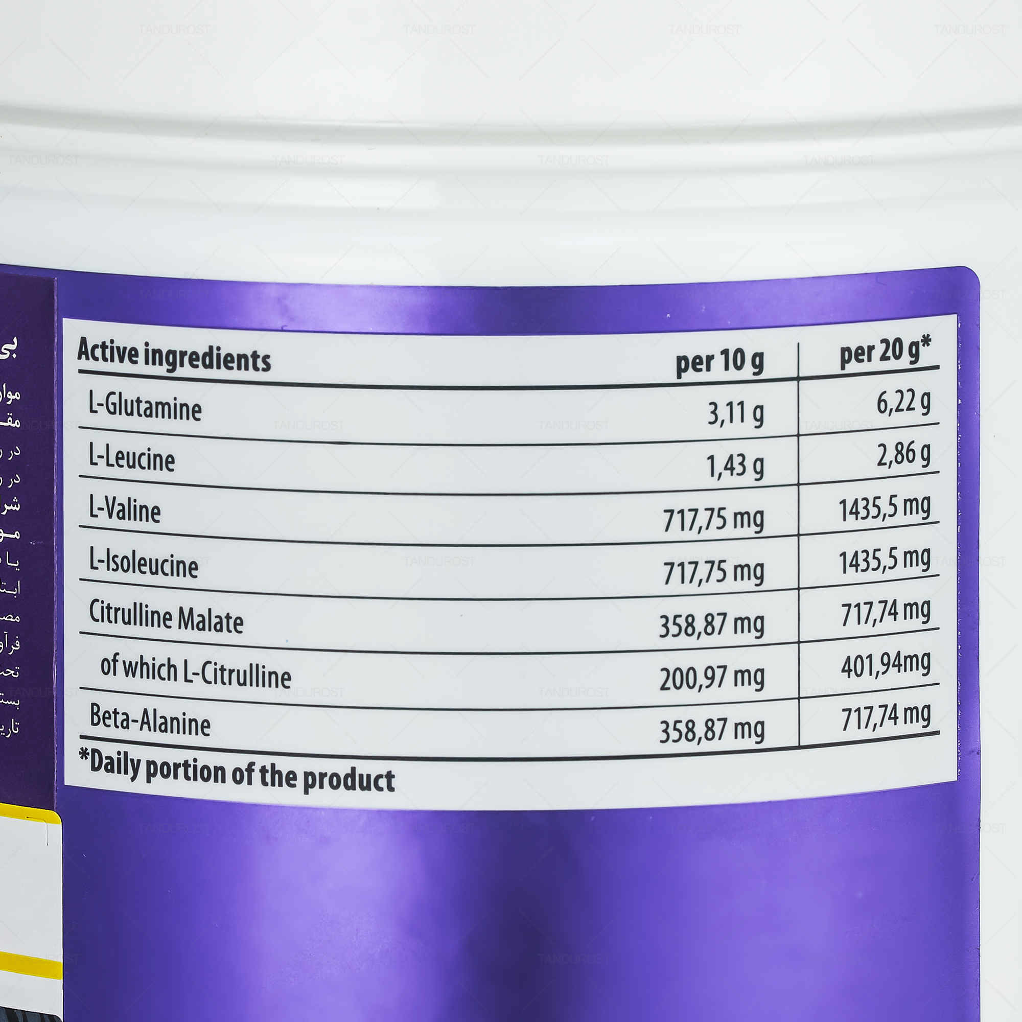 ارزش غذایی هر پیمانه | 1.5 گرم بی سی ای ای، 1.5 گرم گلوتامین، 180 میلی گرم سیترولین مالات، 180 میلی گرم بتاآلانین |