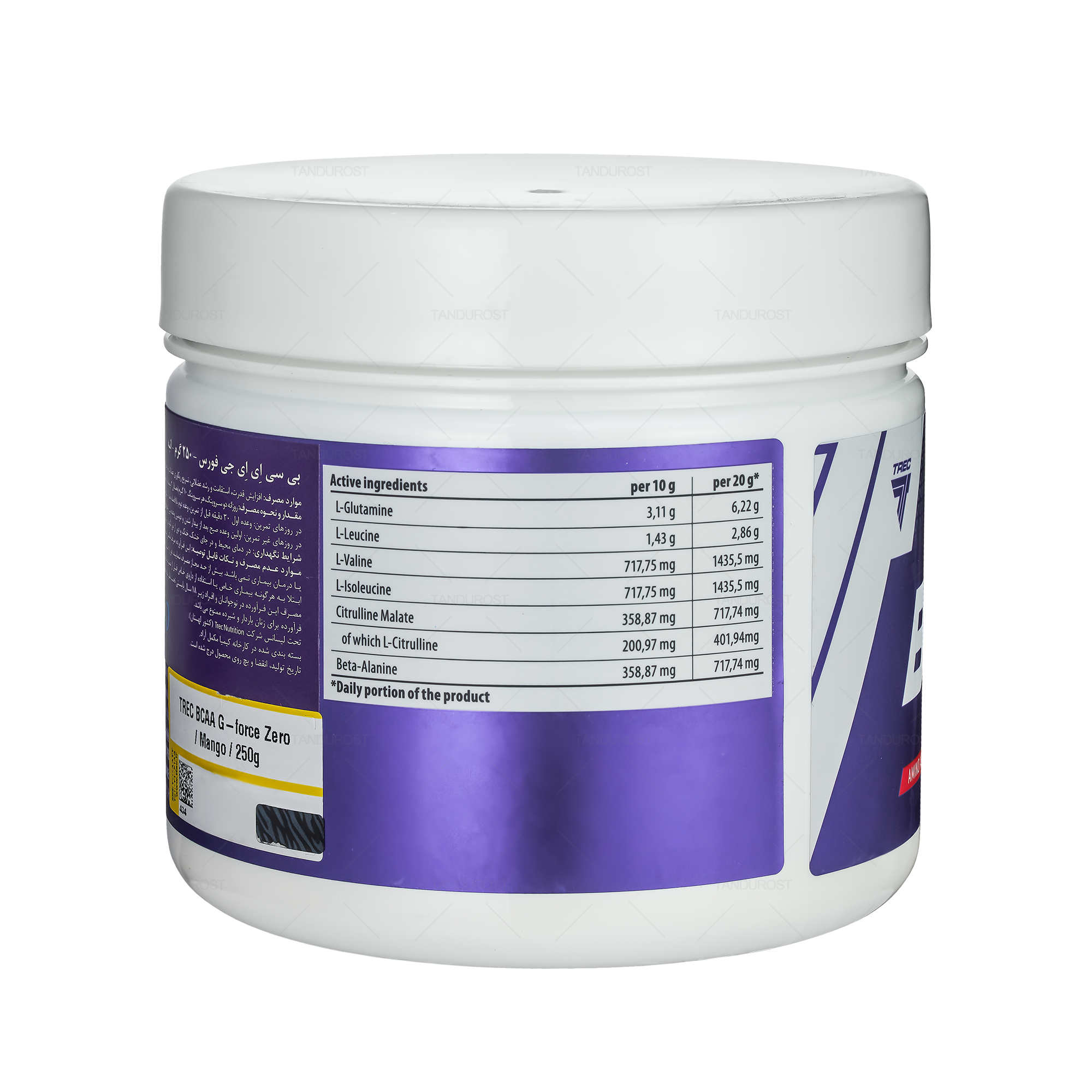 مکمل بی سی ای ای جی فورس زیرو ترک نوتریشن لهستان که تحت لیسانس این شرکت در داخل کشور بسته بندی می گردد مکمل آمینو اسیدی شاخه دار بسیار کاملی است که حاوی سه آمینو اسید اصلی لوسین ایزولوسین و والاین می باشد، نسبت این سه آمینو اسید شاخه دار در این مکمل ورزشی 2:1:1 است. بی سی ای ای جی فورس زیرو ترک نوتریشن در کنار عضله سازی ویک حجم خشک عضلانی، کات مناسبی به عضلات داده و به ریکاوری عضلانی و افزایش بازده عضلات نیز کمک می کند. بی سی ای ای جی فورس زیرو ترک نوتریشن حاوی گلوتامین، سیترولین مالات و بتاآلانین می باشد که بتاآلانین قدرت انفجاری عضله را افزایش داده و کارایی تمرینی را بالا می برد. بی سی ای ای جی فورس زیرو ترک نوتریشن به صورت پودر طعم دار و در بسته بندی های 250 گرمی عرضه می گردد. هر پیمانه این مکمل ورزشی 5 گرم بوده که شامل: 1.5 گرم بی سی ای ای، 1.5 گرم گلوتامین، 180 میلی گرم سیترولین مالات و 180 میلی گرم بتاآلانین می باشد.