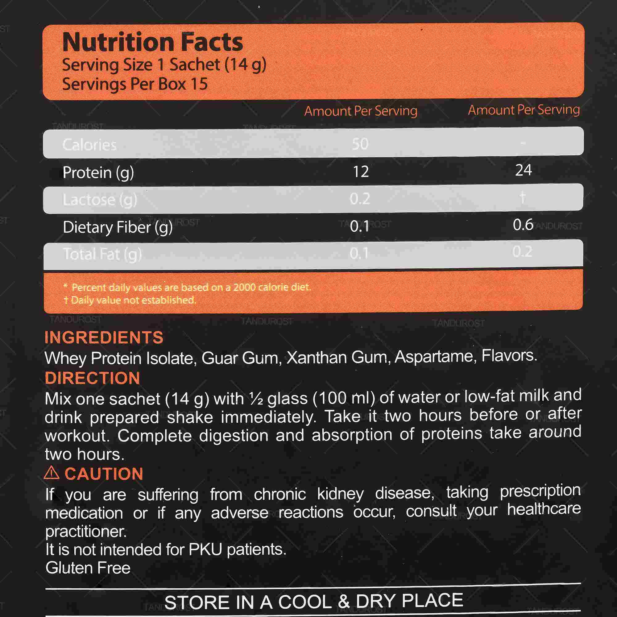 | مقادیر هر ساشه | 12 گرم پروتیئن وی ایزوله، 50 کالری، بدون کربوهیدرات و چربی |