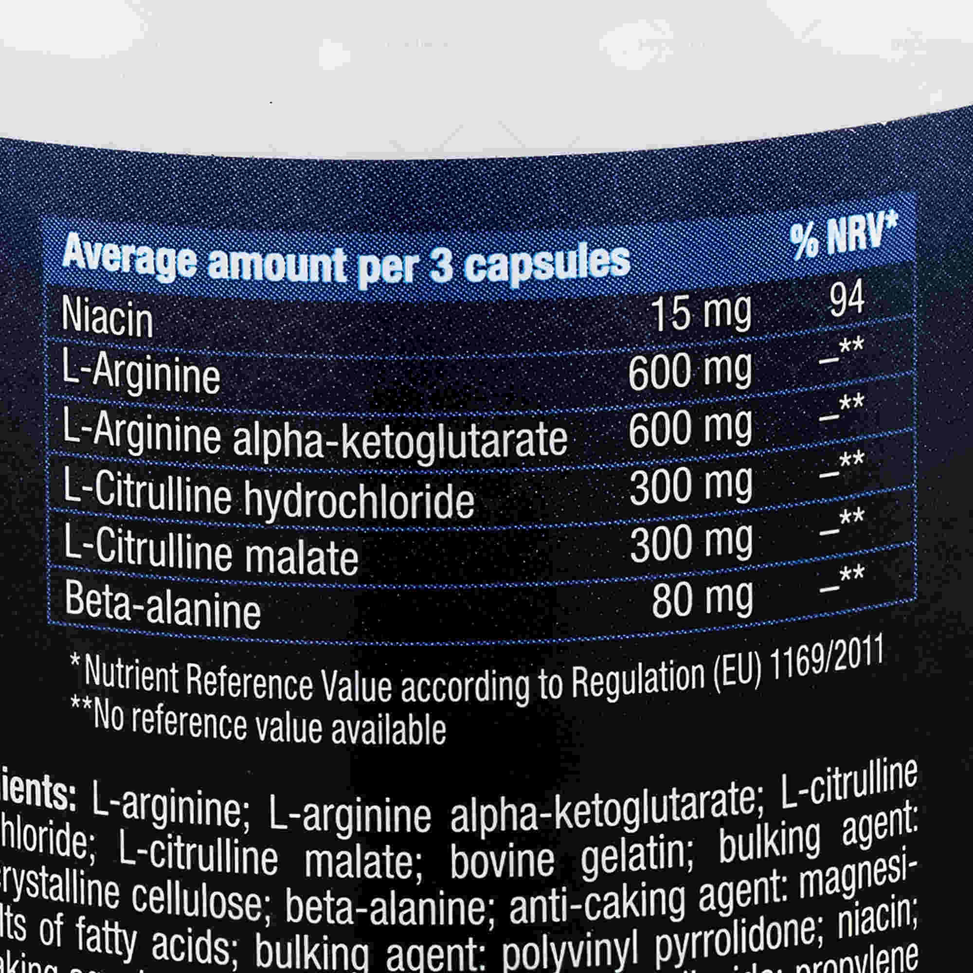 مقادیر هر کپسول | 200 میلی گرم سیترولین، 200 میلی گرم آرژنین، 200 میلی گرم آرژنین ای ای کی جی، 26 میلی گرم بتاآلانین |