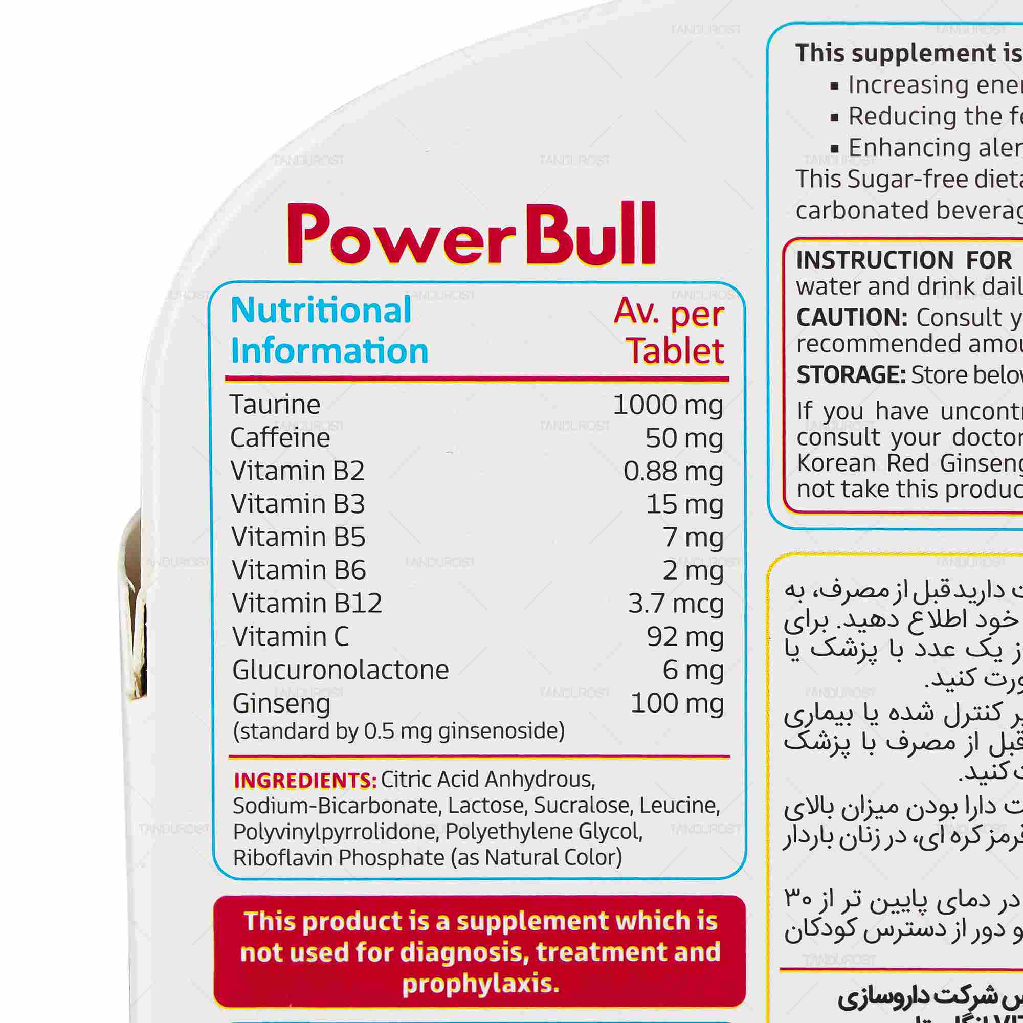 | مقادیر هر قرص | 1000 میلی گرم تائورین، 50 میلی گرم کافئین، 92 میلی گرم ویتامین C و 100 میلی گرم جینسینگ، 6 میکروگرم گلوکورونولاکتون |