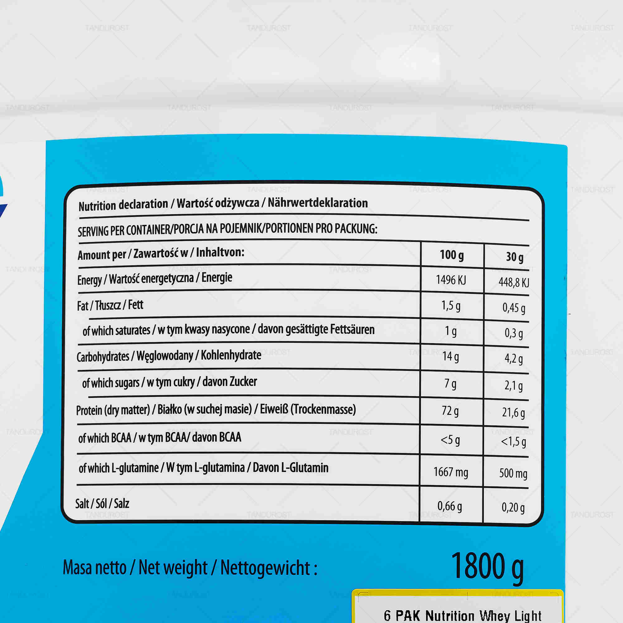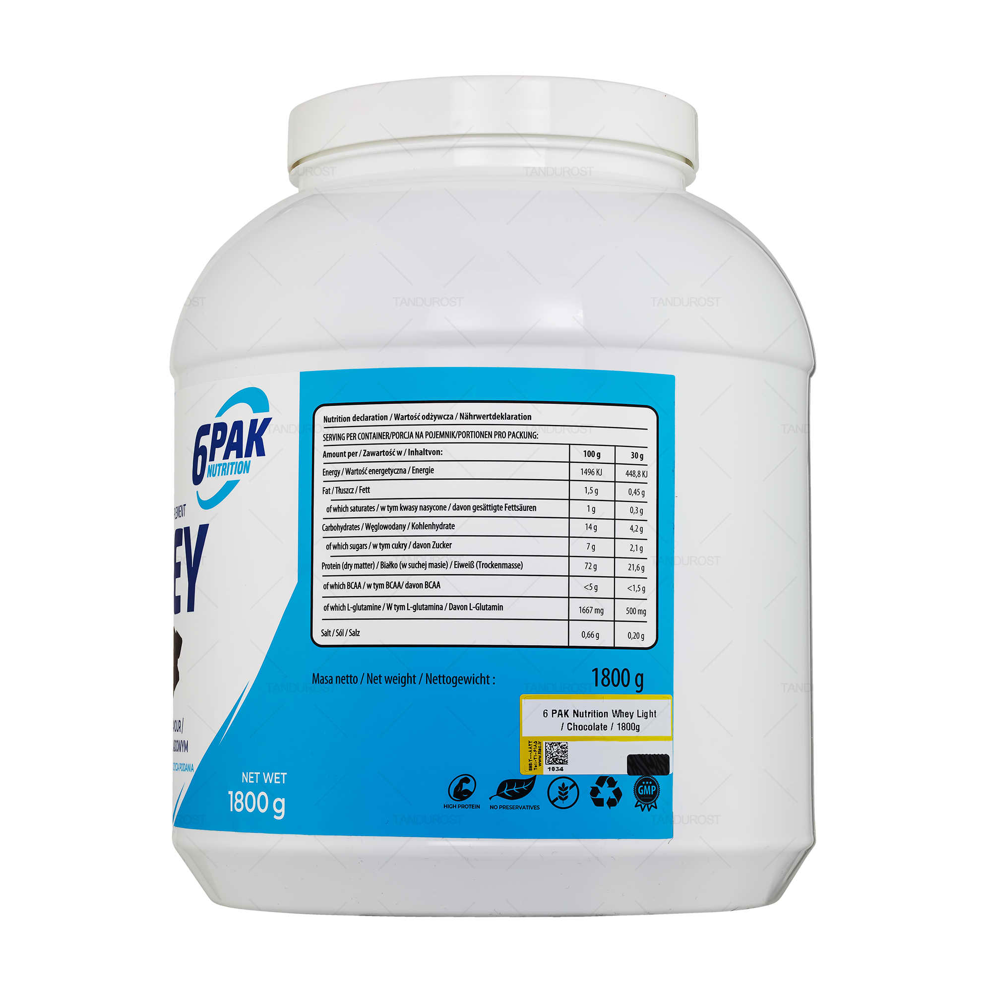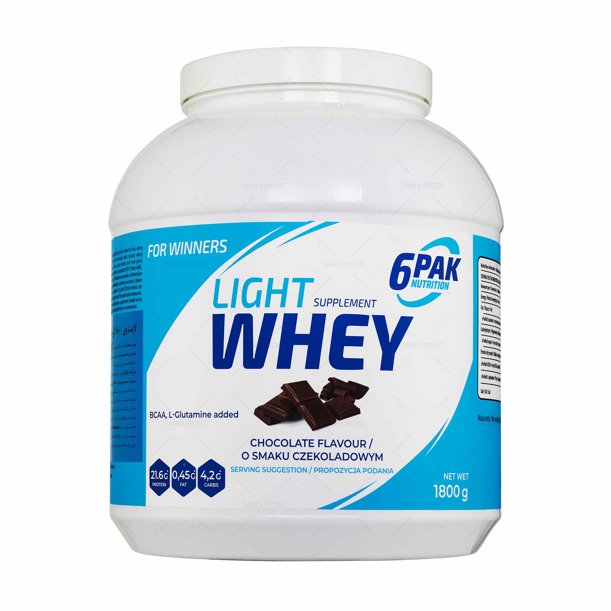 مکمل پروتئینی لایت وی برند 6 پک نوتریشن لهستان که تحت لیسانس این شرکت توسط مجموعه کیمیا مکمل آراد در داخل کشور بسته بندی می گردد، مکمل پروتئین وی کنسانتره بسیار باکیفیتی بوده که مقادیری گلوتامین و بی سی ای ای نیز به صورت جداگانه به آن اضافه شده است. لایت وی 6 پک نوتریشن لهستان با داشتن72 درصد پروتئین وی کنسانتره و 14 درصد کربوهیدرات به رشد سلول های عضلانی کمک کرده و حجم خوبی را به عضلات می دهد. مکمل لایت وی 6 پک نوتریشن به صورت پودر طعم دار و در بسته بندی های یک کیلو و هشتصد گرمی عرضه می گردد. هر پیمانه این مکمل ورزشی 45 گرم بوده که میزان برداشتی در هر نوبت 3/2 آن یعنی 30 گرم می باشد. هر 30 گرم این مکمل ورزشی شامل: 22 گرم پروتئین وی، 4.2 گرم کربوهیدرات،