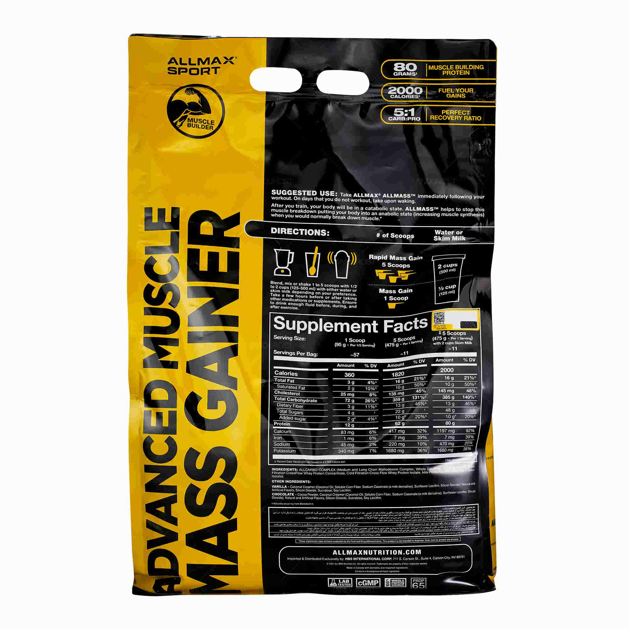 مکمل ماسل گینر آل مس آل مکس کانادا یکی از گینرهای بسیار با کیفیت در دنیا محسوب شده که تحت لیسانس این شرکت در داخل کشور بسته بندی می گردد. ماسل گینر آل مس آل مکس کانادا از 76 درصد کربوهیدرات زود جذب مالتودکسترین و 13 درصد پروتئین وی که مخلوطی از وی کنسانتره و وی ایزوله است تشکیل یافته که با توجه به این ساختار جزو گینرهای زودجذب محسوب شده که به سرعت جذب عضلات شده و تاثیر خود را نشان می دهد. ماسل گینر آل مکس کانادا به دلیل داشتن پروتئین وی ایزوله حاوی طیف کاملی از شاخه های آمینواسیدی همچون بی سی ای ای و گلوتامین بوده که به خوبی به عضله سازی و ریکاوری بعد از تمرین ورزشی نیز کمک می کند. ماسل گینر آل مس آل مکس کانادا به صورت پودر طعم دار، در بسته بندی های 5.44 کیلو گرم کیسه ای عرضه می گردد. هر پیمانه این مکمل ورزشی 95 گرم بوده که شامل: 72 گرم کربوهیدرات، 12 گرم پروتئین، 360 گرم کالری و 3 گرم چربی کل می باشد.