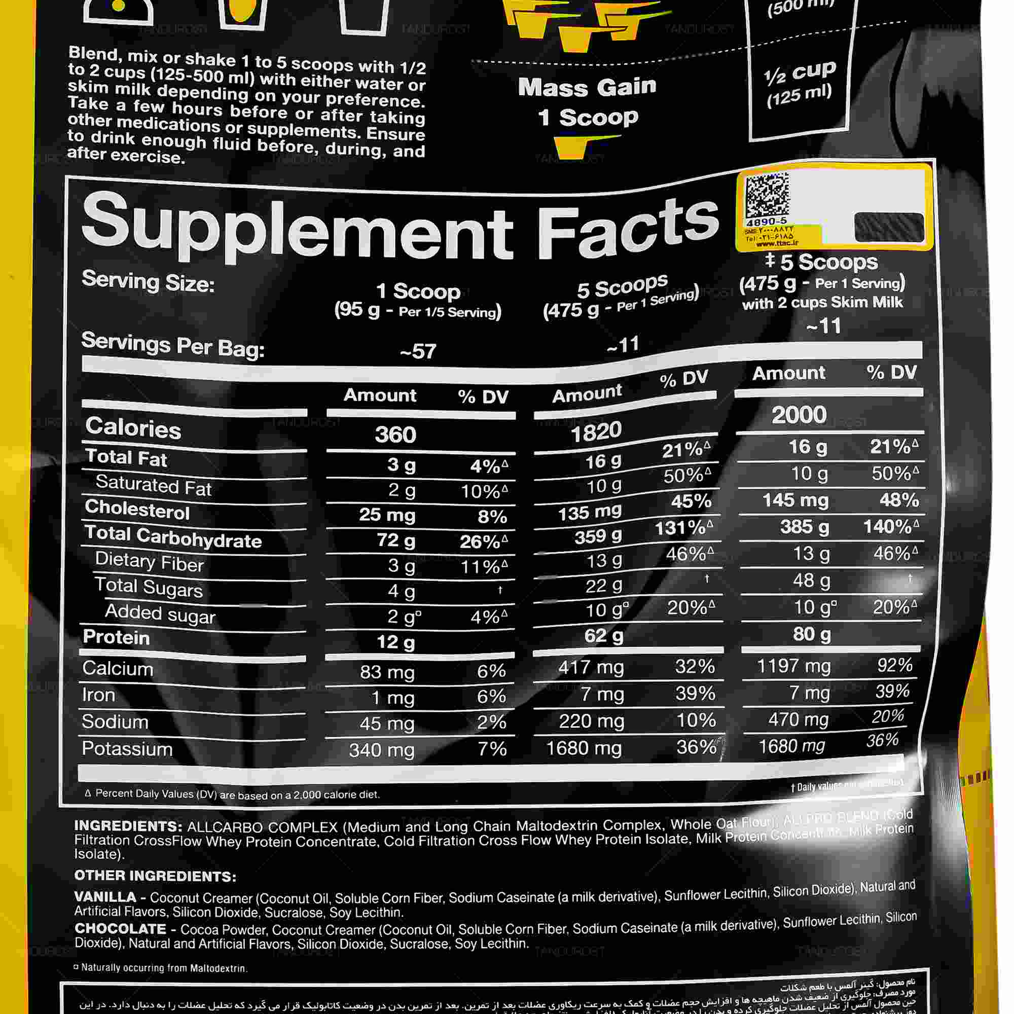 | ارزش غذایی هر پیمانه | 72 گرم کربوهیدرات، 12 گرم پروتیئن وی، 3 گرم چربی کل و 360 کالری |