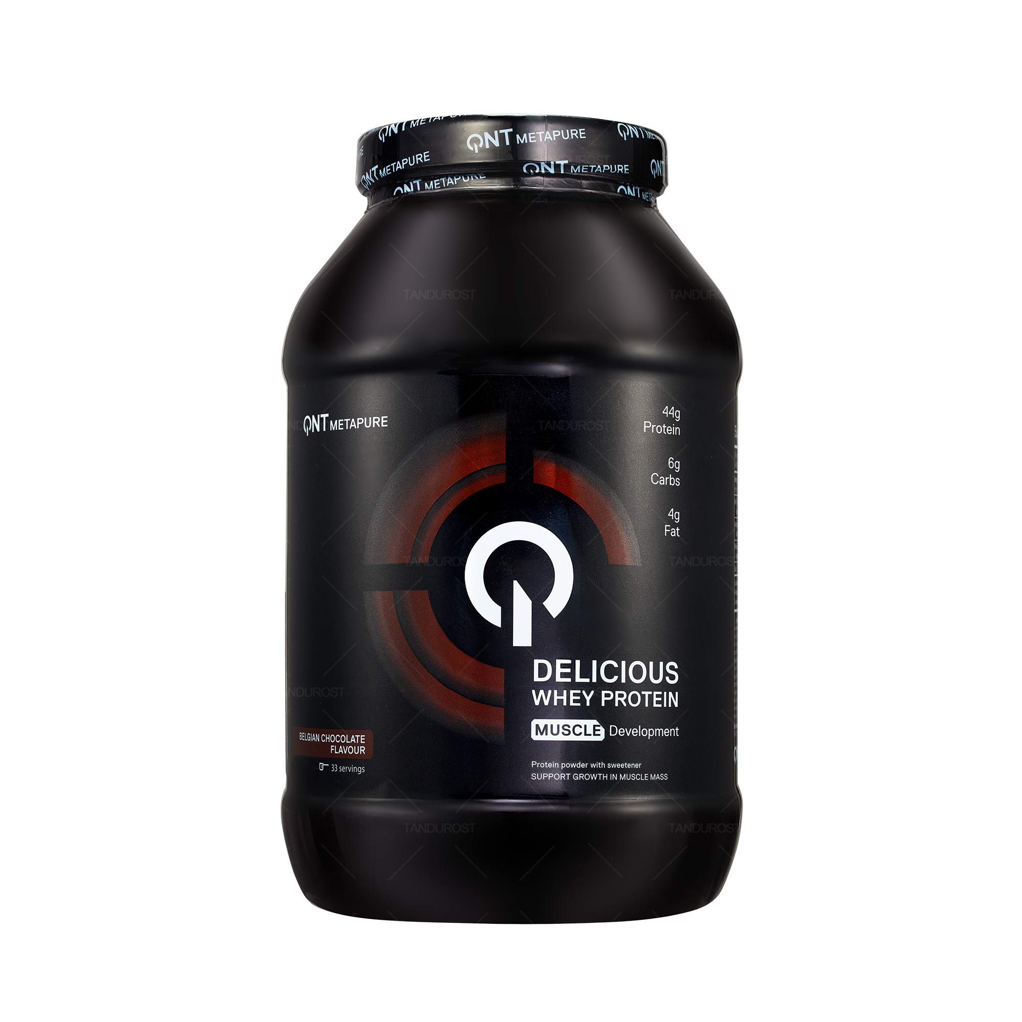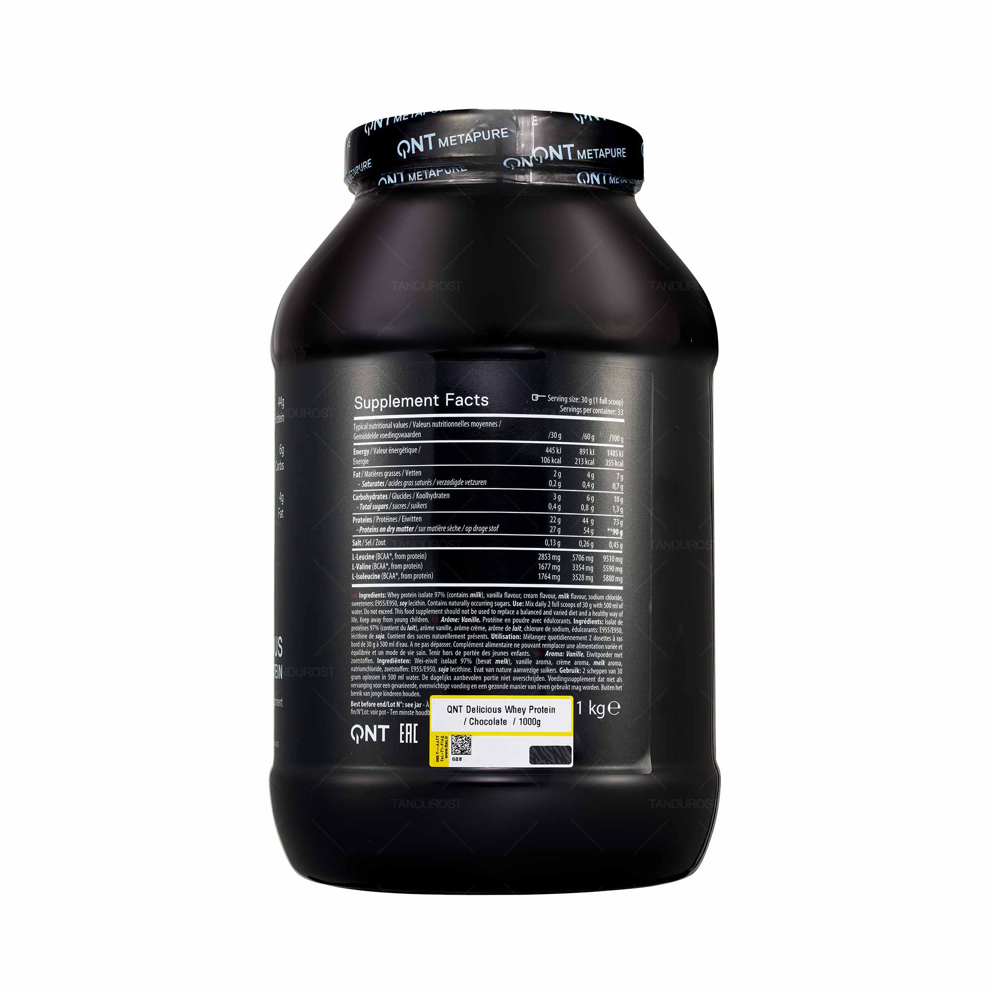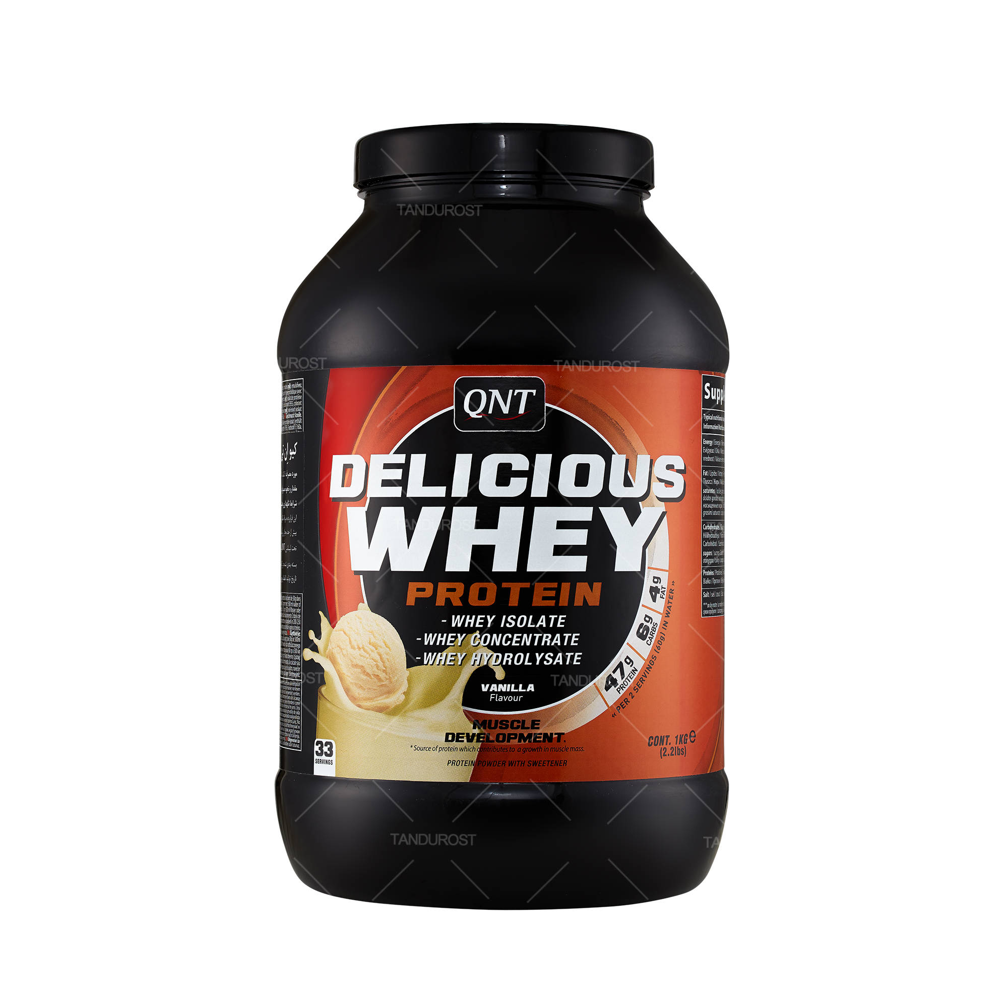 دلیشس وی پروتئین شرکت کیو ان تی بلژیک یک مکمل پروتئینی بسیار با کیفیت بوده که از سه نوع پروتئین وی کنسانتره، ایزوله و هیدرولیزه تشکیل شده است. پروتئین وی کیو ان تی به صورت کل دارای 78 درصد پروتئین و 10.5 درصد کربوهیدرات می باشد که این مکمل پروتئینی با این ترکیب درصد و نوع پروتئین های تشکیل یافته بسیار مناسب برای ورزشکارانی است که نیاز به عضله سازی در کمترین زمان ممکن را دارند، چون با داشتن ترکیبی از پروتئین وی ایزوله و هیدرولیزه بسیار خالص و زود جذب در کمترین زمان ممکن، این مکمل جذب بافت عضلانی شده و به رشد وافزایش توده عضلانی کمک شایانی می کند. دلیشس وی کیو ان تی بلژیک که هم اکنون در داخل کشور بسته بندی می گردد دارای پیمانه 30 گرمی بوده و در بسته بندی 1 کیلوگرمی عرضه می گردد. هر پیمانه 30 گرمی این مکمل پروتئینی شامل:23.3 گرم پروتئین وی، 3 گرم کربوهیدرات، 121 کالری و چربی کل 2 گرم می باشد. لازم به یادآوری است که دلیشس وی کیو ان تی بدون گلوتن( گندم) می باشد.