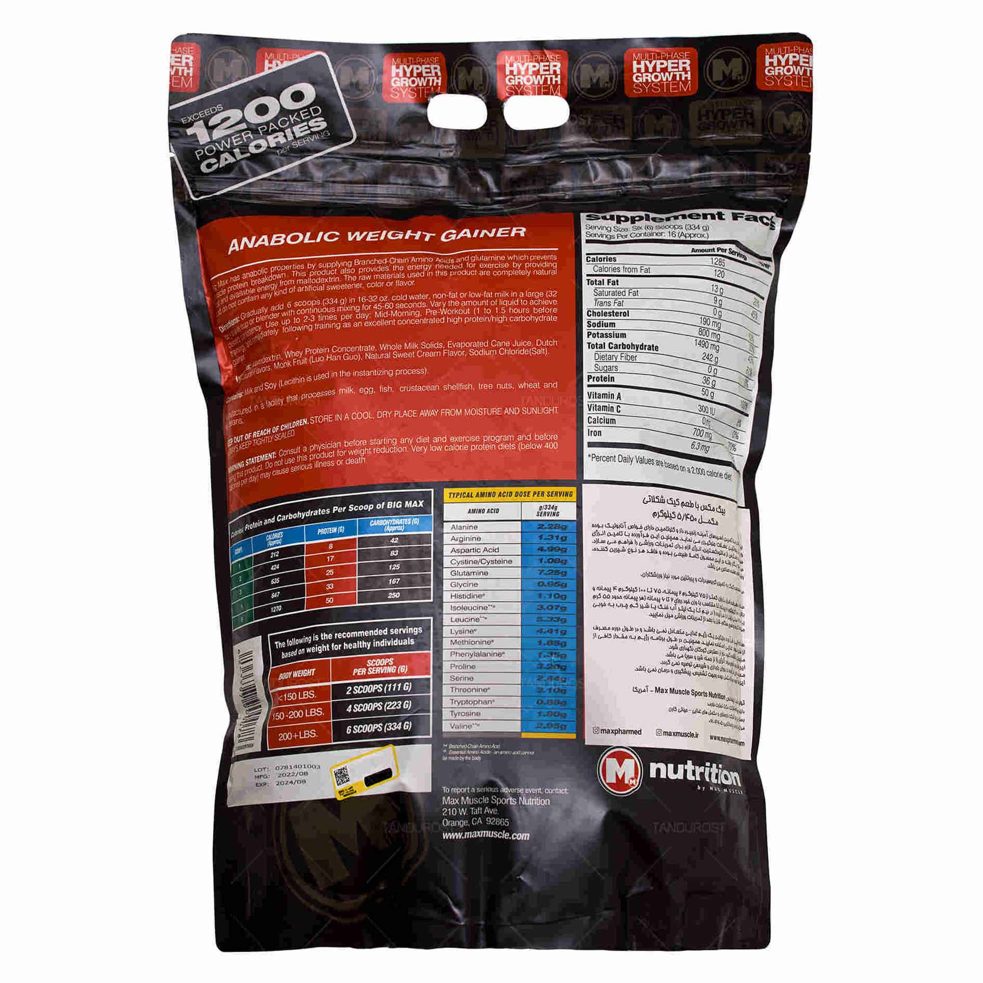 گینر بیگ مکس 50 شرکت مکس ماسل امریکا یک مکمل افزایش وزن بسیار با کیفیتی بوده که مخصوص افرادی سختی وزن می گیرند طراحی شده است، این مکمل ورزشی با داشتن 72 درصد کربوهیدرات و 15درصد پروتئین بهترین انتخاب برای وزن گیری و افزایش حجم وسایز بدن می باشد. گینر بیگ مکس دارای پیمانه 55 گرمی بوده که هر پیمانه آن شامل 40 گرم کربوهیدرات، 8 گرم پروتئین، 2 گرم بی سی ای ای، 1 گرم گلوتامین، 214 کالری و چربی کل 2 گرم می باشد. گینر بیگ مکس 50 به صورت کیسه ای و در بسته بندی های 5.5 کیلوگرمی تحت لیسانس مکس ماسل امریکا در داخل کشور توسط شرکت مکس فارمد نمایند آنها، بسته بندی و عرضه می گردد. در انتها این نکته قابل توجه است که این مکمل افزایش وزن بدون گلوتن تولید شده و افرادی که به گلوتن حساس هستند به راحتی میتوانند از این گینر استفاده کنند.قابل توجه است که این مکمل ورزشی بدون گلوتن تولید می شود.