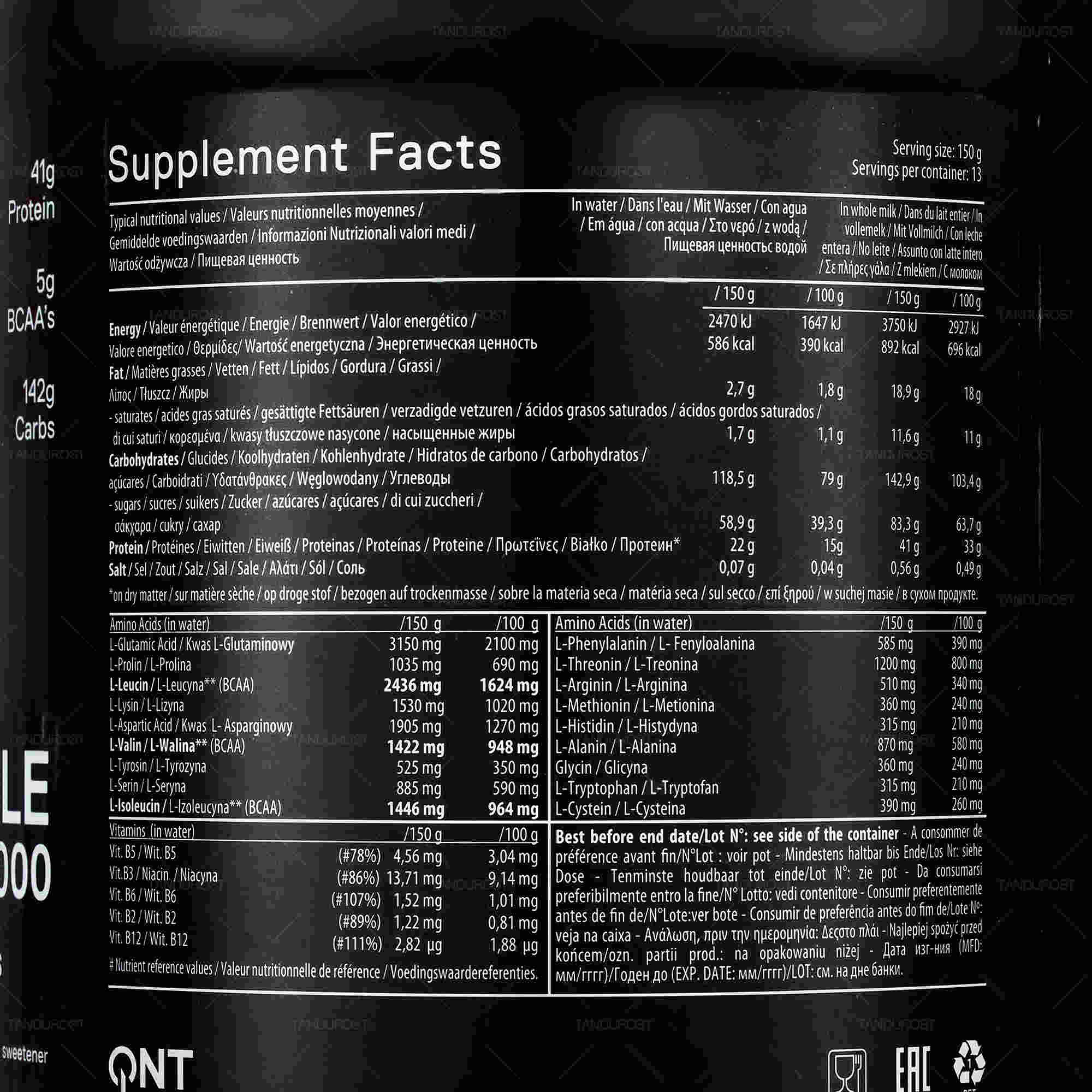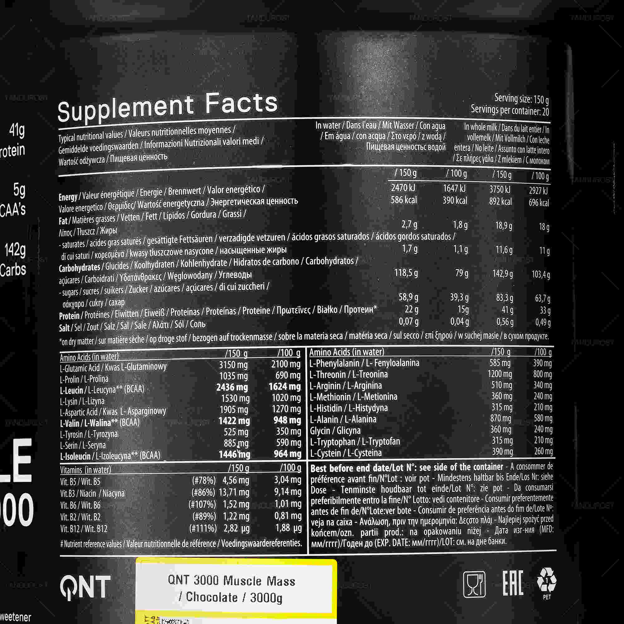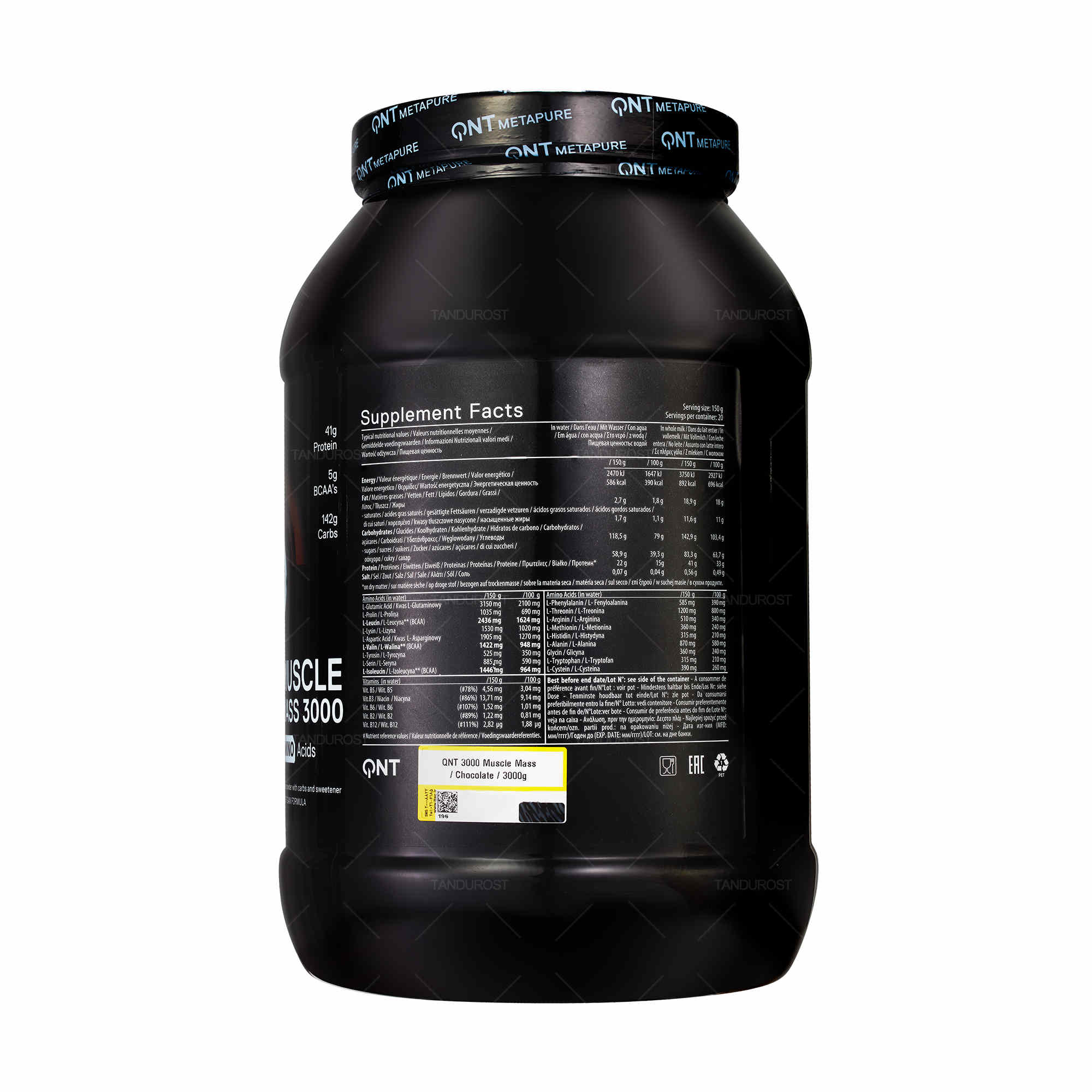 گینر ماسل مس 3000 کیو ان تی بلژیک یک مکمل ورزشی بسیار با کیفیت جهت افزایش وزن و حجم عضلات می باشد. ماسل مس 3000 کیو ان تی با داشتن 76 درصد کربوهیدرات از نوع مالتودکسترین و دکستروز به خوبی در کوتاهترین زمان ممکن وزن ایده آلی به ورزشکار داده و همچنین با داشتن 14 درصد پروتئین از جنس وی کنسانتره به خوبی در کنار افزایش وزن به عضله سازی ورزشکاران نیز کمک می کند. گینرماسل مس 3000 کیو ان تی در دو بسته بندی 2 و 4.5 کیلوگرمی عرضه می شود. ماسل مس 3000 کیو ان تی حاوی پیمانه 50 گرمی بوده که هر پیمانه آن شامل: 38 گرم کربوهیدرات، 7 گرم پروتئین، 190 کالری و چربی کل 1 گرم می باشد.