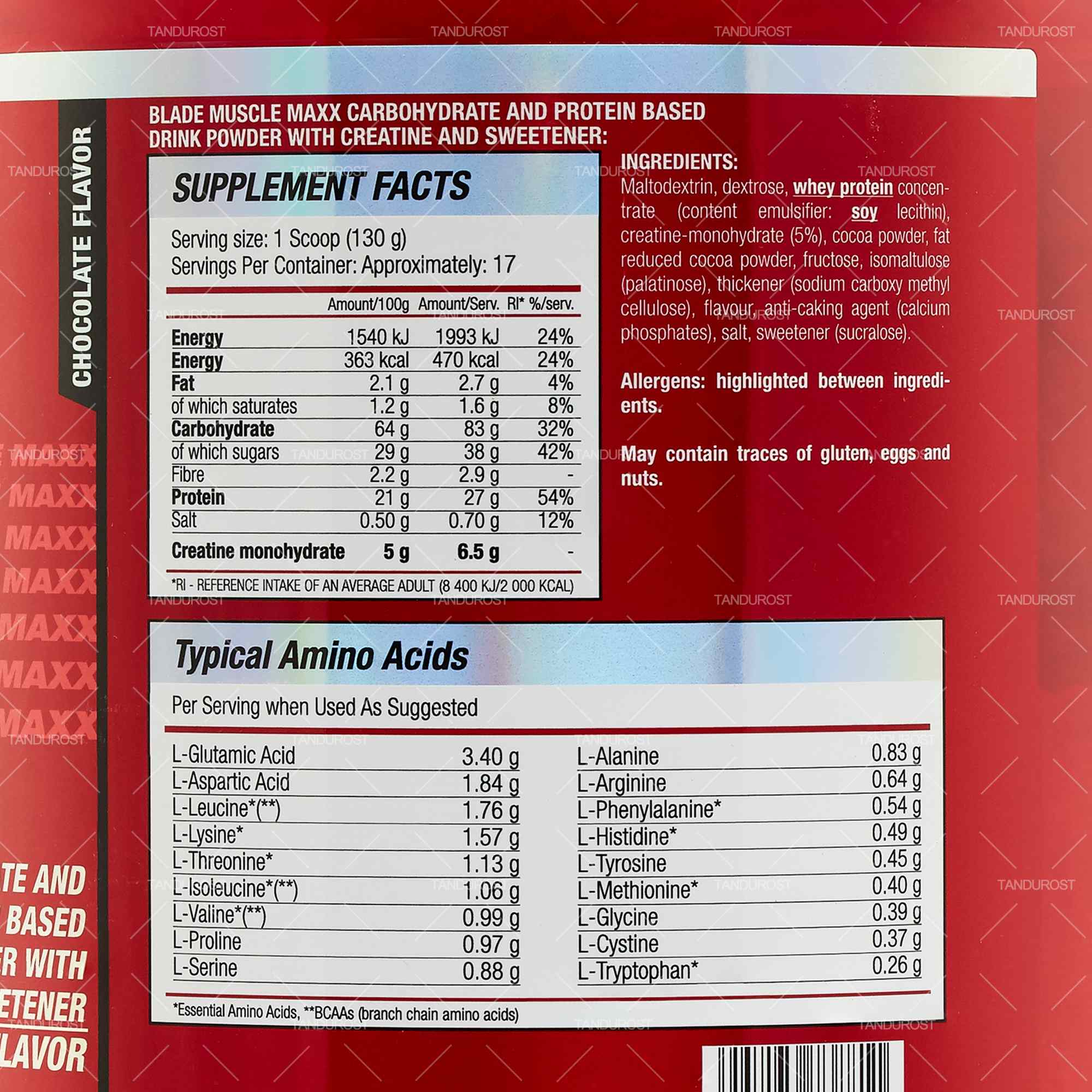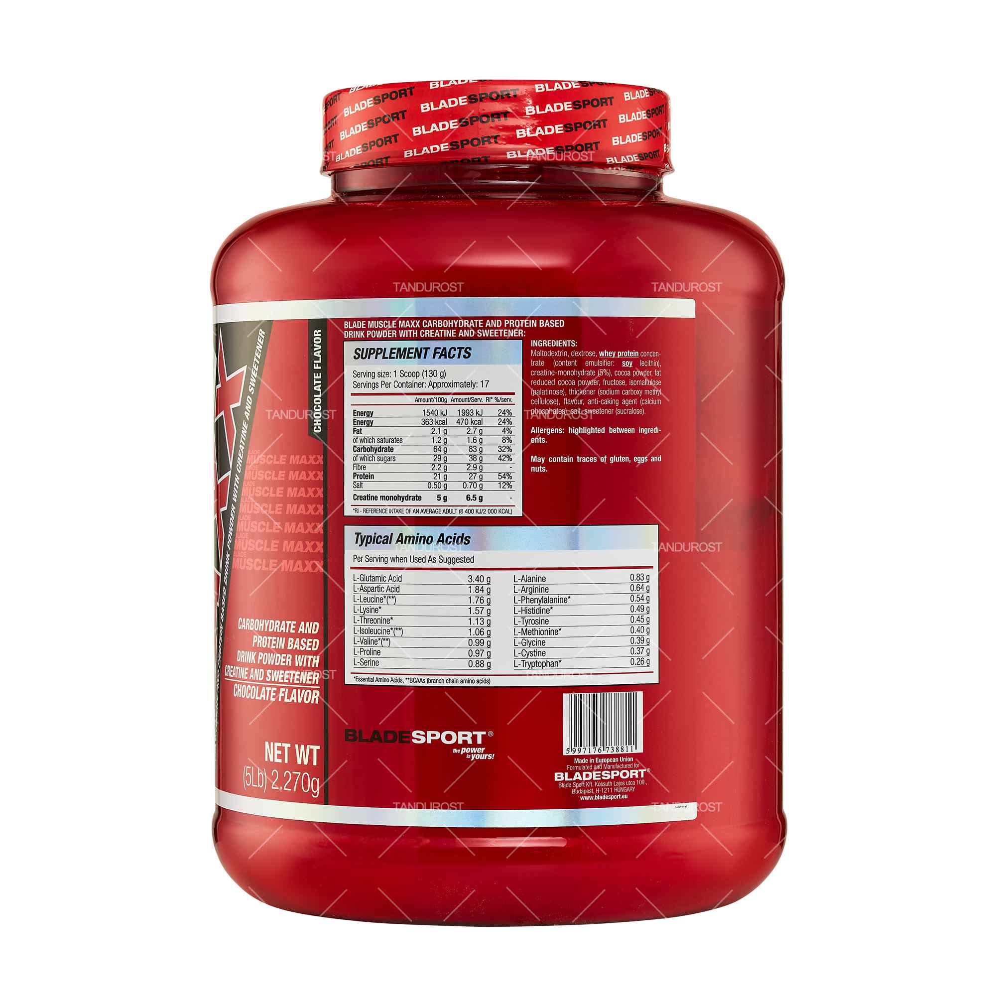 گینر ماسل مکس بلید اسپرت مجارستان که در داخل کشور بسته بندی می گردد یک مکمل افزایش وزن تمام عیار و کامل با کیفیت ساخت بسیار مطلوبی می باشد. گینر ماسل مکس بلید اسپرت با داشتن 21 درصد پروتئین وی کنسانتره و 64 درصد کربوهیدرات و 5 درصد کراتین، نیاز ورزشکارانی که احتیاج به افزایش وزن همراه افزایش حجم عضله را دارند کاملا برطرف می کند. می توان گفت که با تهیه این مکمل ورزشی افزایش وزن، دیگر نیازی به تهیه کراتین به صورت جداگانه نمی باشد. ورزشکارانی که همراه افزایش وزن نیاز به مقداری افزایش حجم عضلات را نیز دارند این مکمل ورزشی بهترین انتخاب می باشد، همچنین گینر ماسل مکس بلید اسپرت به علت داشتن 20 درصد پروتئین وی دارای طیف کاملی از اسید آمینه های ضروری و غیرضروری هم چون گلوتامین ، آرژنین و لوسین ، ایزولوسین و والین نیز می باشد. گینرماسل مکس بلید اسپرت در بسته بندی 4 کیلوگرمی و به صورت دبه ای عرضه می گردد. هر پیمانه این مکمل افزایش وزن 130 گرم بوده که شامل: 83 گرم کربوهیدرات، 27 گرم پروتئین، 6.5 گرم کراتین، 2.9 گرم فیبر، 2.7 گرم چربی کل و 470 کالری می باشد.